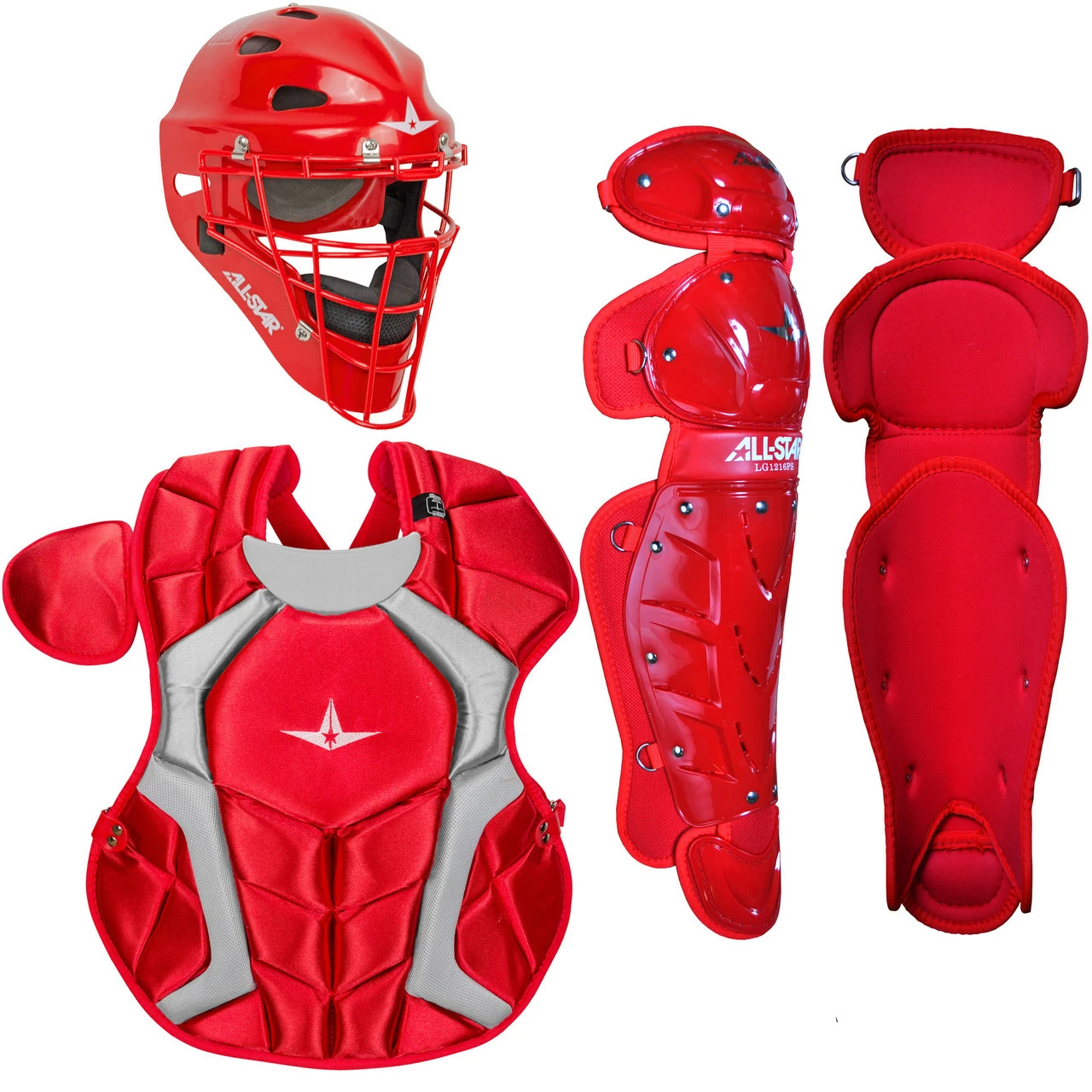 Gear-up with the youth NOCSAE approved Player Series baseball catcher’s package from All-Star Sporting Goods. All-Star is one of the most preferred brands for Major League catchers. Featuring the Player’s Series MVP hockey style catcher’s mask along with NOCSAE approved Player’s Series chest protector and leg guards. Also includes a catcher’s throat guard and catcher’s equipment bag. The Player’s Series catcher’s set offers superior protection and comfort, plus a professional look. Recommended for ages 7-9.