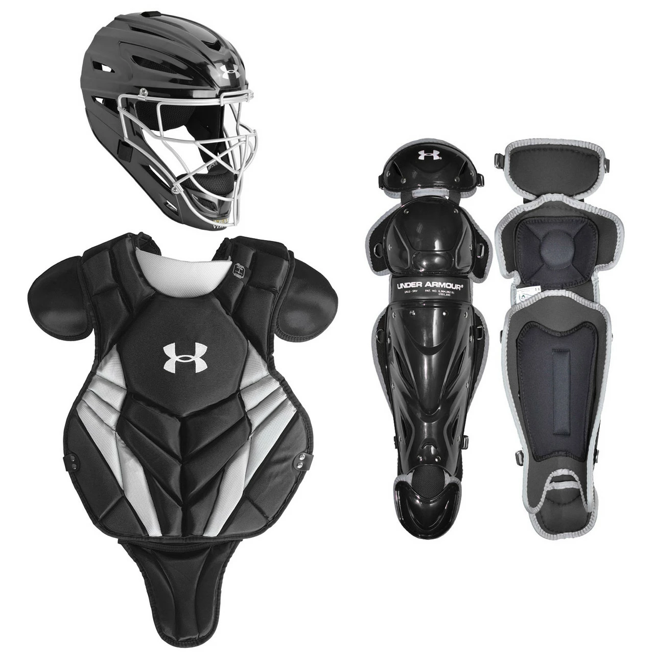 Gear-up with the new NOCSAE approved intermediate Converge Victory Series baseball catcher’s package from Under Armour. Under Armour is one of the most preferred brands for Major League catchers. Featuring the Converge Victory Series hockey style catcher’s mask along with NOCSAE approved Converge Victory Series chest protector and leg guards. Also includes a catcher’s throat guard. The Converge Victory Series catcher’s set offers superior protection and comfort, plus a professional look. Recommended for ages 12-16.
